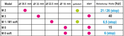 Rolling Star gibt es in vier verschiedenen Größen. Die Rollen M1 und M2 sind einfedernd. Die Rollen M3 und M0 sind in starrer Ausführung. Die Rollen M1 und M0 sind als „soft-Modell“ erhältlich. 38 mm / 33mm /22,5mm / 19mm